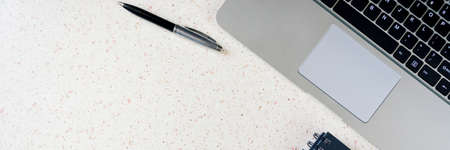 desktop with laptop keyboard and pen and plate with croissant panorama, panoramic, horizontal