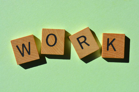 An engaging flat lay of letter tiles spelling the word WORK, symbolizing professional motivation and productivity in a creative workspace.
