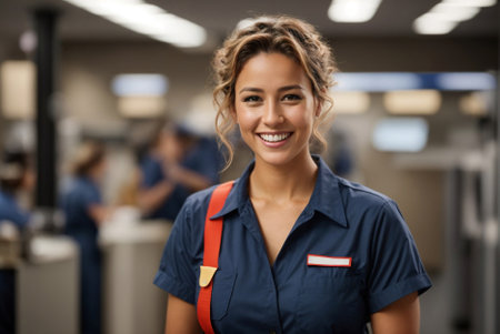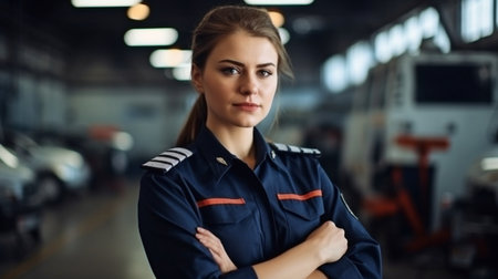 A woman in a work uniform against a bright background, a confident pose. An expressive look that emphasizes professionalism and energy.