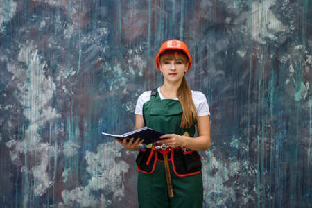 teen girl builder in protective helmet and uniform, childhood development, copy space