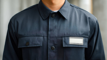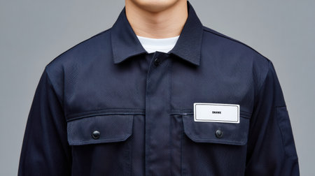 A person is wearing a navy blue work uniform with a blank name badge on the chest. The background is plain and simple, highlighting the uniform.