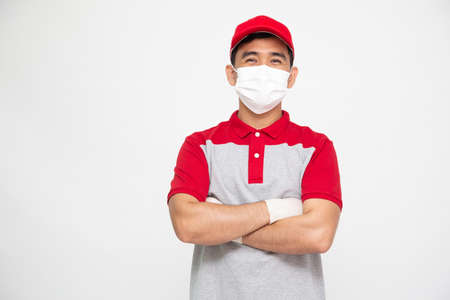 Transportation worker man wearing mask with arms crossed isolated on white background, Asian model