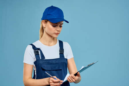 woman in work uniform blue cap service delivery service light background