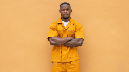 A confident young man stands against a warm yellow background, wearing a vibrant orange uniform, exuding a strong and stylish vibe perfect for modern fashion.