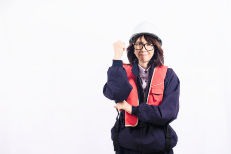Portrait woman in industry uniform and protective helmet posing at isolated white empty background, looking at camera. Serious industrial lady worker in workwear standing in isolation. Copy text space