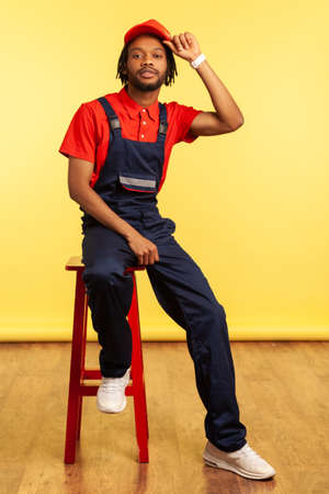 Portrait of handsome stylish male worker sitting on chair looking directly at camera, keeping hand on his visor cap. Indoor studio shot isolated on yellow background.