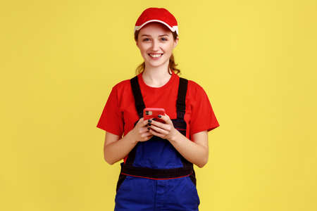 Portrait of smiling worker woman using mobile phone for online supporting, expressing positive emotions, looking at camera, wearing overalls cap. Indoor studio shot isolated on yellow background.