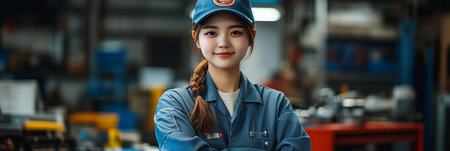 Asian female auto mechanic smiles with confidence in car workshop.