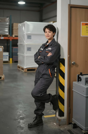 Portrait of a female warehouse worker standing in front of a door