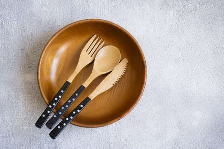 Wooden bowl and cutlery on white background. Natural serving table setting