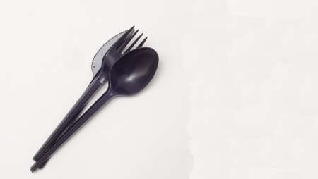 black plastic disposable knife,spoon on white background, copyspace.