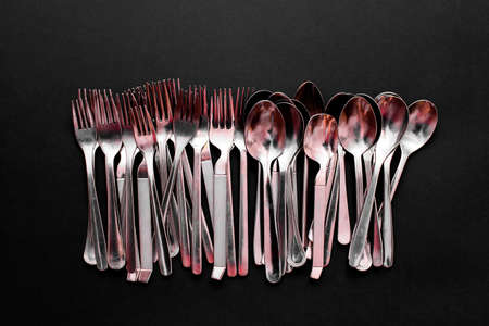 Cutlery forks and metal steel spoons for feeding, clean and isolated on black background.