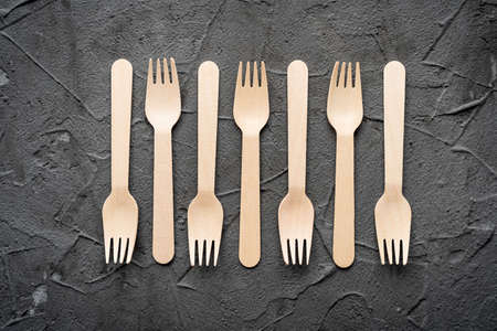 Disposable wooden cutlery. Accessories for eating outdoors. Dark background.