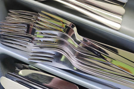 Selective focus of shiny cutlery in a dishwasher after cleaning. Forks, Knifes and Spoons.