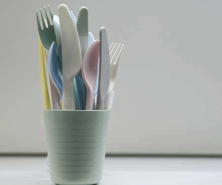 Disposable plastic utensil waste over dark blue background.