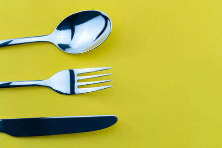 Close-up and selective focus of the set of dinning cutlery on a yellow background. Flat lay and top view of a spoon, fork, and knife with copy space.