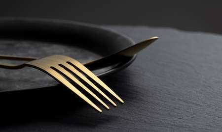 Empty plate, fork and knife. Black kitchen utensils set on stone table. fork and knife. Black kitchen utensils placed on a black table. Top view flat surface with space to copy