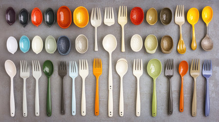 A vibrant collection of colorful cutlery and dishes arranged neatly on a gray surface, perfect for showcasing modern kitchen style and dining elegance.