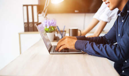 Cropped shot of business people typing on computer laptop while working with her team in co working space