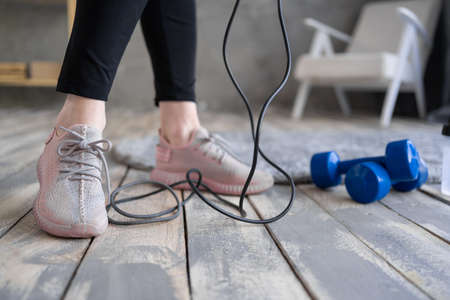 woman feet on the floor after exercising with dumbbell and jump rope at home. healthy and sport
