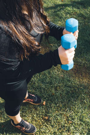 Plus size woman holding two blue dumbbells outdoor. Healthy life. Fitness concept