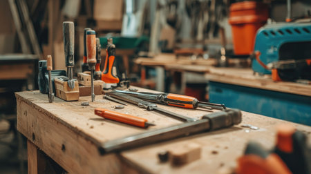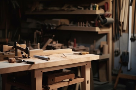 workshop, with woodworking tools and materials neatly arranged on the workbench, created with generative ai