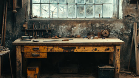 Worn tools rest on an old workbench, capturing the charm of a rustic workshop filled with natural light, inviting creativity.