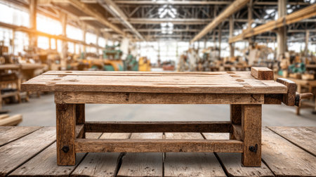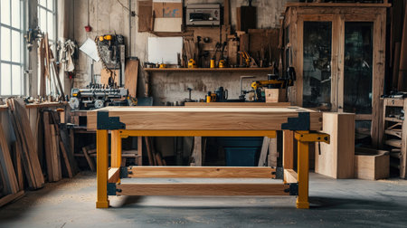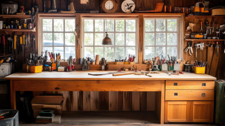 A well-crafted wooden workbench set in a rustic workshop filled with various tools and equipment. The inviting space showcases creativity and craftsmanship.