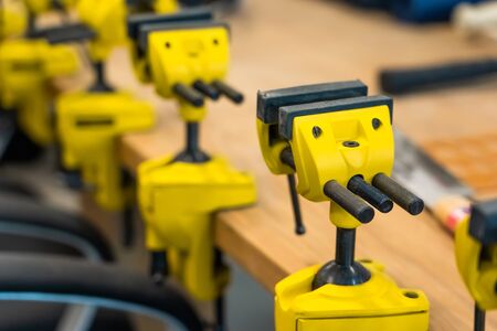 Many Yellow Vises are Set on the Work Bench at the School. New Grips or Jaw Vices Fixed at Woodwork Workshop.