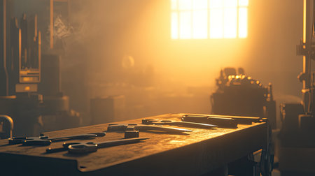 A stunning scene capturing warm sunlight filtering through a workshop, casting serene shadows over various tools laid on a wooden table, evoking creativity and craftsmanship.