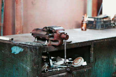 Old tools on a table in a garage. Retro style photo.