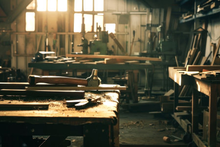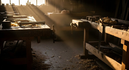 Sunlight streams through windows, illuminating a woodworker's bench with tools, capturing the essence of craftsmanship. Download this timeless scene. Generated A.I.