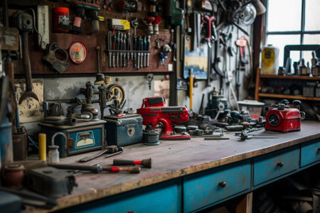 A cluttered workbench filled with an assortment of tools and equipment, A mechanic's workbench showcasing multiple vintage tools, AI Generated