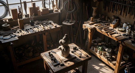A traditional sculptor's or woodcarver's workshop filled with tools and workbenches under natural light. A clay or stone sculpture sits in the center, surrounded by an array of chisels, hammers, and other carving instruments, showcasing a space of creativity and craftsmanship.