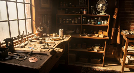 A cluttered jewelry maker's workbench filled with tools pliers and materials bathed in warm window sunlight. The vintage workshop scene evokes a sense of craftsmanship and creativity.