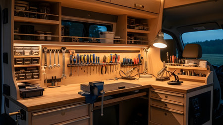 The interior of a van converted into a mobile workshop, featuring organized tools on the walls and a clean workbench. Warm lighting illuminates the soldering station and various equipment, showcasing a compact and efficient workspace.