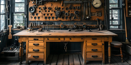 Wooden workbench with hand tools neatly organized on top. Space for creativity featuring different stuff for building. Generative AI