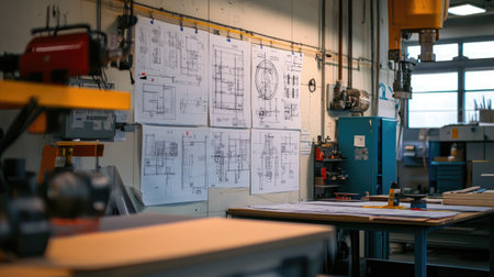 A well-organized industrial workshop featuring detailed technical drawings on the wall, machinery, and tools for engineering and fabrication projects.