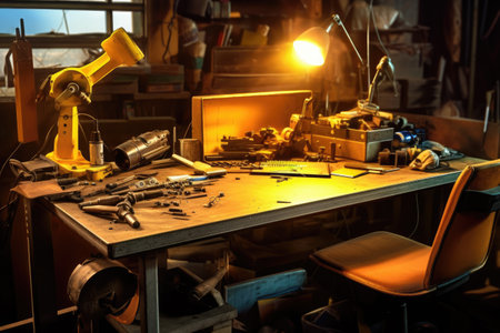 A cluttered workshop table filled with various tools and a yellow bottle under warm lighting, showcasing the essence of craftsmanship and manual repair work.