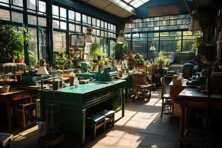 workshop room, untidy, ready for work, vintage retro color tone