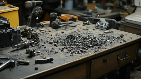 A workbench cluttered with various tools and metal shavings, showcasing the essence of manual labor and industrial craftsmanship in a workshop setting.