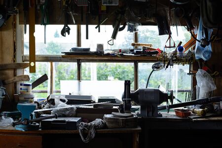 Workbench with many tools inside a mechanic workshop specialized in repairing bicycles