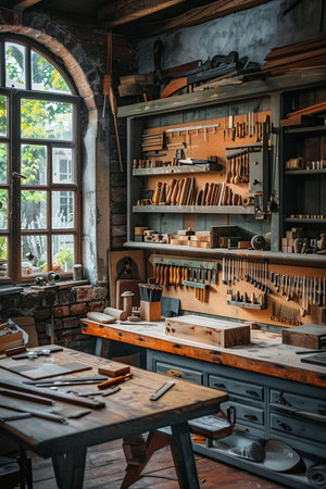 Small craft workshop with efficient space utilization, handmade tools, and creative decor, copy space