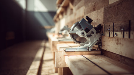 A serene woodworking workshop showcasing precision circular saws arranged on a rustic wooden workbench, illuminated by warm natural light, capturing a creative space for carpentry.