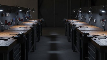Storage showing workshop benches with tools and vises keywords: workshop, workbench, tools, vise, industrial, garage, manufacturing, repair, metalworking, woodworking, equipment, organized, storage, drawers, lamps, lighting, work, station, machinery, craft, diy, engineering, production, factory, clean, tidy, professional, workspace, heavy duty, sturdy, tool rack, pegboard description: a dimly lit workshop featuring two long wooden workbenches lined with various tools and vises. overhead...
