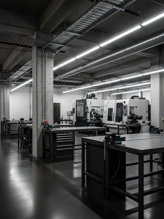A modern industrial workshop featuring rows of CNC machines, metal workbenches, and overhead lighting, with concrete pillars and exposed pipes.