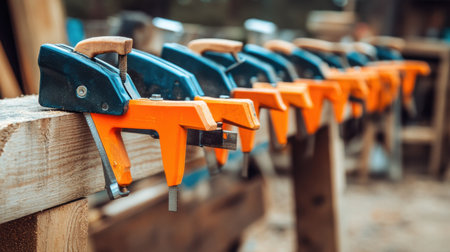 Clamps holding wood pieces together during glue-up process on work surface
