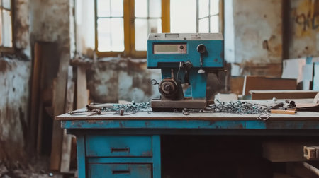 A vintage sewing machine sits on a weathered wooden table, surrounded by tools and chains, in a rustic workshop filled with natural light and character.