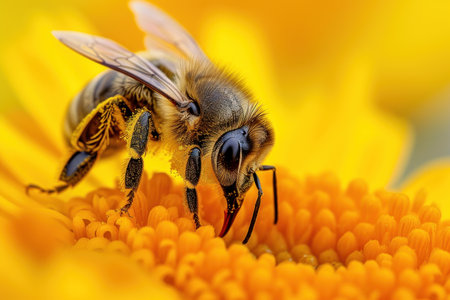 Macro view of a busy bee covered in golden pollen foraging on a vibrant yellow flower