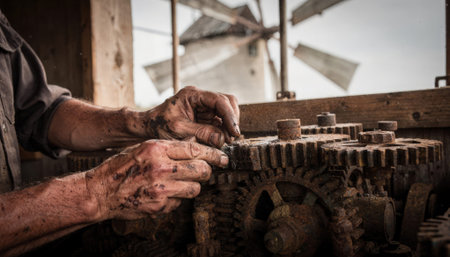 Closeup on hands cleaning metal cogwheels of an old windmill while the rotating blades fade softly in the distance.